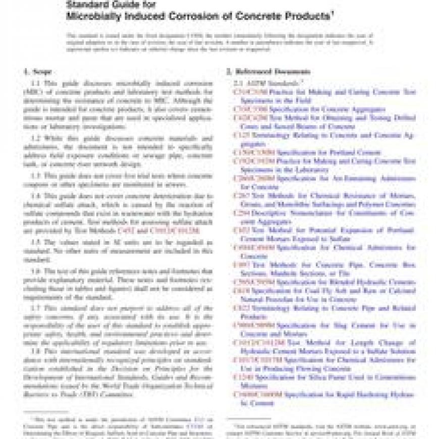1.1This guide discusses microbially induced corrosion (MIC) of concrete products and laboratory test methods for determining the resistance of concrete to MIC. Although the guide is intended for concrete products, it also covers cementitious mortar and paste that are used in specialized applications or laboratory investigations.