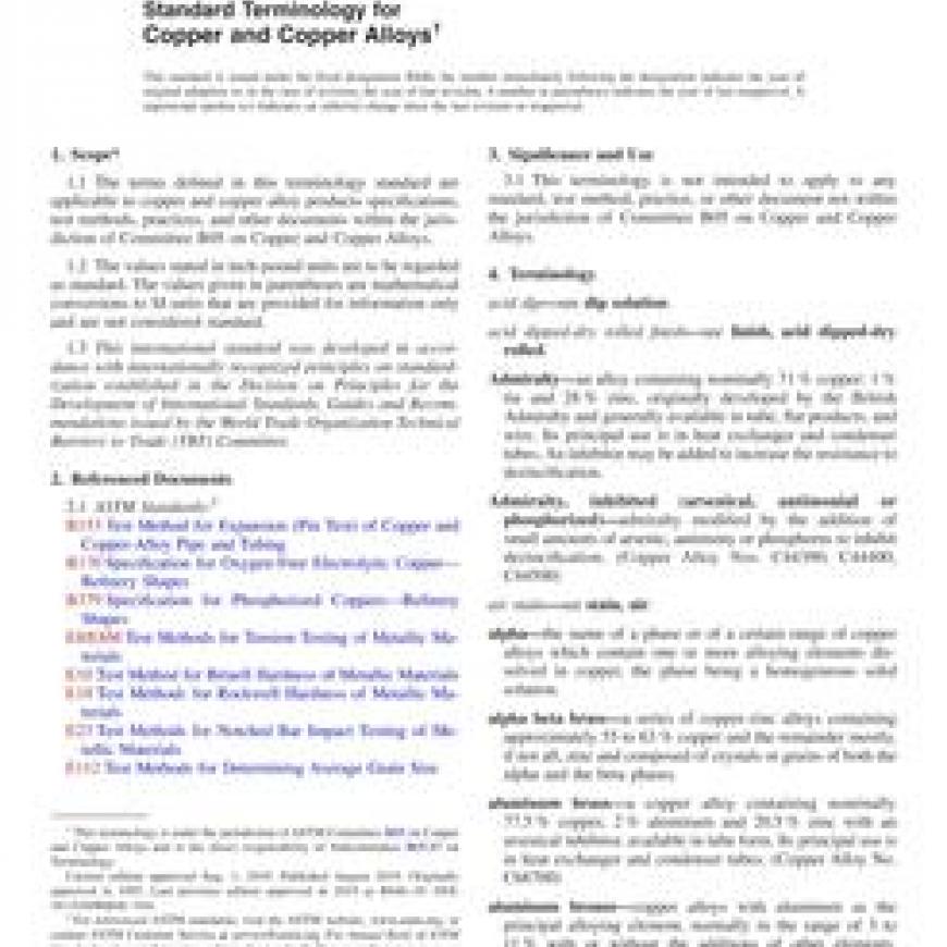 1.1The terms defined in this terminology standard are applicable to copper and copper alloy products specifications, test methods, practices, and other documents within the jurisdiction of Committee B05 on Copper and Copper Alloys.