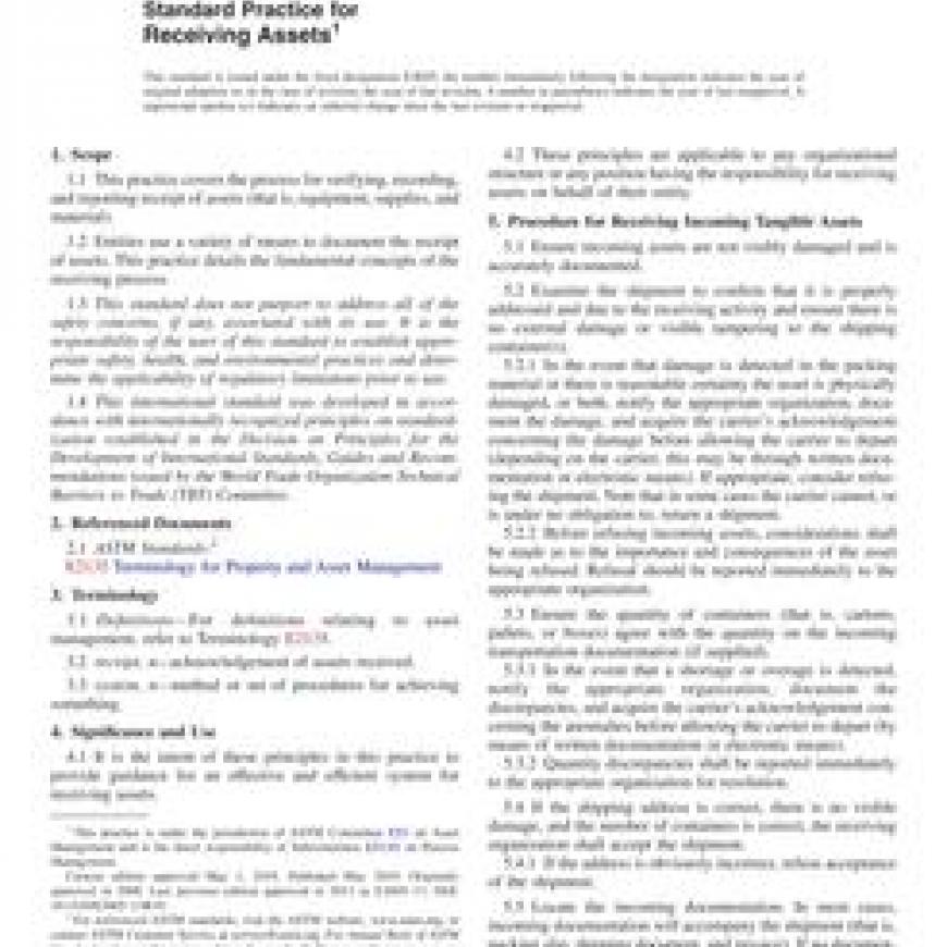 1.1This practice covers the process for verifying, recording, and reporting receipt of assets (that is, equipment, supplies, and material).