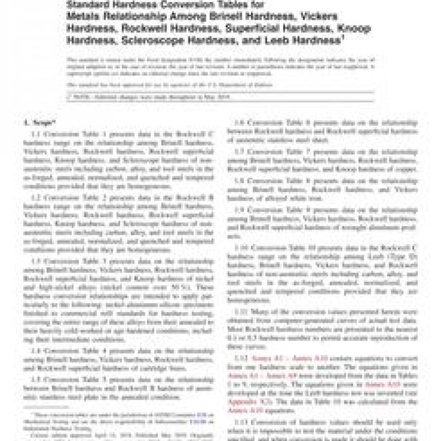 1.12Annex A1 - Annex A10 contain equations to convert from one hardness scale to another. The equations given in Annex A1 - Annex A9 were developed from the data in Tables 1 to 9, respectively. The equations given in Annex A10 were developed at the time the Leeb hardness test was invented (see Appendix X2). The data in Table 10 was calculated from the Annex A10 equations.