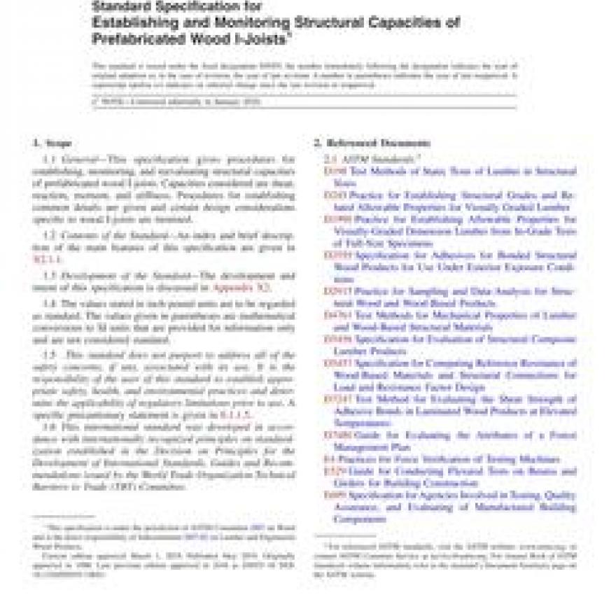 1.1General-This specification gives procedures for establishing, monitoring, and reevaluating structural capacities of prefabricated wood I-joists. Capacities considered are shear, reaction, moment, and stiffness. Procedures for establishing common details are given and certain design considerations specific to wood I-joists are itemized.