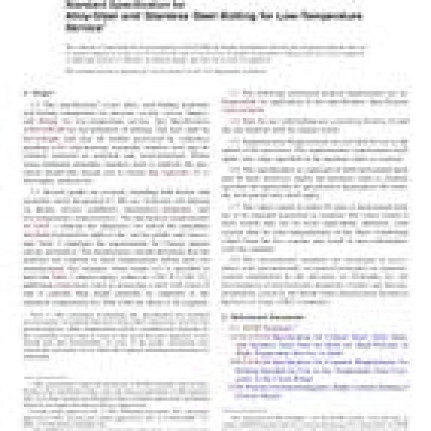1.1This specification2 covers alloy steel bolting materials and bolting components for pressure vessels, valves, flanges, and fittings for low-temperature service. See Specification A962/A962M for the definition of bolting. The bars shall be hot-wrought and may be further processed by centerless grinding or by cold drawing. Austenitic stainless steel may be solution annealed or annealed and strain-hardened. When strain hardened austenitic stainless steel is ordered, the purchaser should take special care to ensure that Appendix X1 is thoroughly understood.