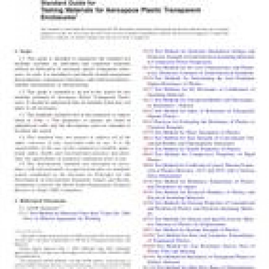 1.1This guide is intended to summarize the standard test methods available on individual and composite materials utilized in fabrication of aerospace plastic transparent enclosures. As such, it is intended to specifically include transparent thermoplastics, transparent elastomers, and reinforced plastics, whether thermoplastic or thermosetting.