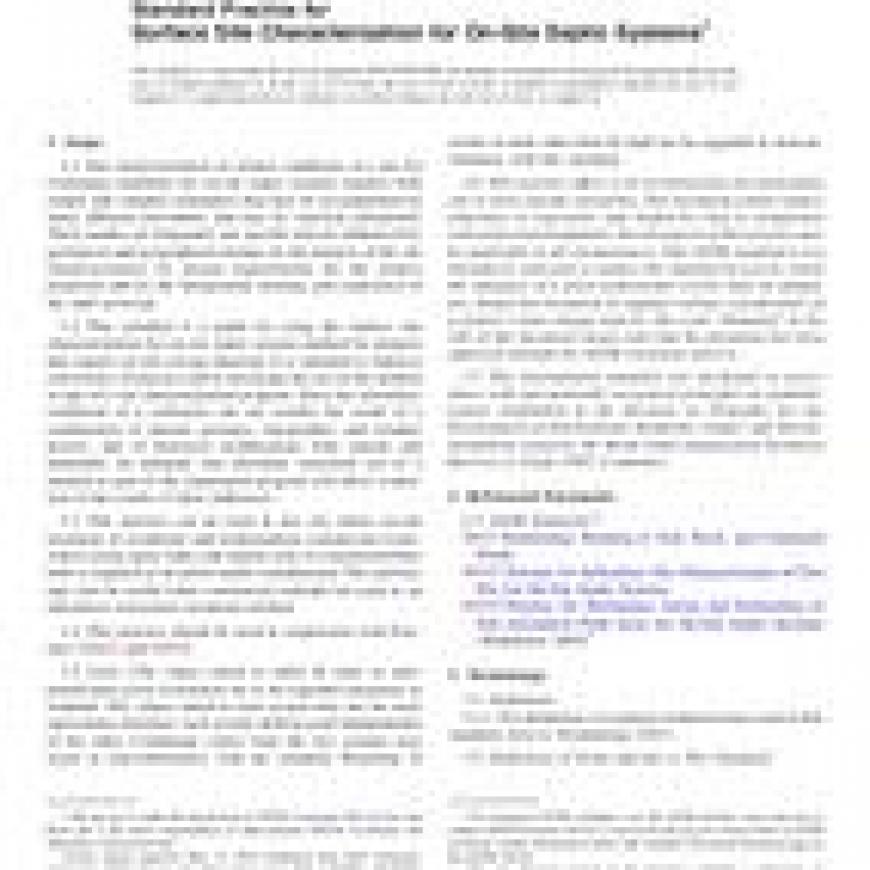 1.1Site characterization of surface conditions at a site for evaluating suitability for on-site septic systems requires both simple and complex techniques that may be accomplished by many different procedures and may be variously interpreted. These studies are frequently site specific and are influenced by geological and geographical settings, by the purpose of the site characterization, by design requirements for the project proposed, and by the background, training, and experience of the staff involved.