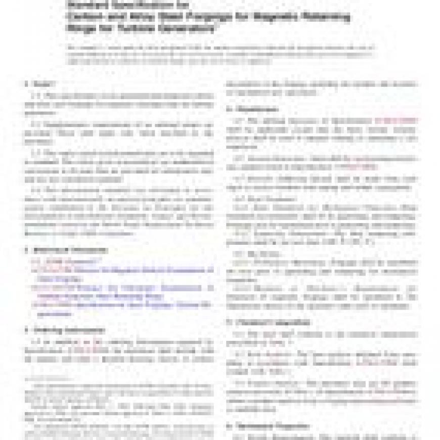 1.1This specification covers quenched and tempered carbon and alloy steel forgings for magnetic retaining rings for turbine generators.