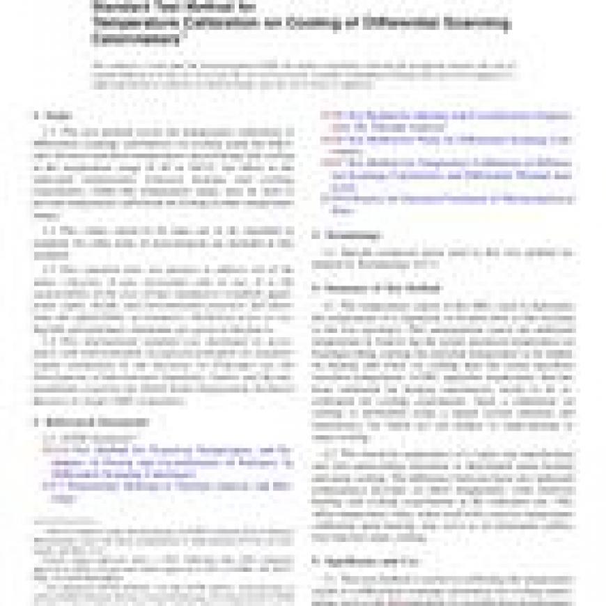 1.1This test method covers the temperature calibration of differential scanning calorimeters on cooling using the difference between transition temperatures upon heating and cooling in the temperature range of 50 to 185C. An offset in the indicated temperature between heating and cooling experiments, within this temperature range, may be used to provide temperature calibration on cooling at other temperature ranges.