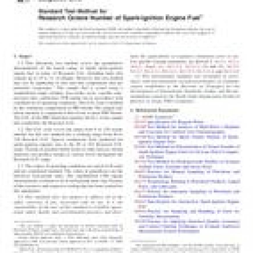 1.1This laboratory test method covers the quantitative determination of the knock rating of liquid spark-ignition engine fuel in terms of Research O.N., including fuels that contain up to 25% v/v of ethanol. However, this test method may not be applicable to fuel and fuel components that are primarily oxygenates.2 The sample fuel is tested using a standardized single cylinder, four-stroke cycle, variable compression ratio, carbureted, CFR engine run in accordance with a defined set of operating conditions. The O.N. scale is defined by the volumetric composition of PRF blends. The sample fuel knock intensity is compared to that of one or more PRF blends. The O.N. of the PRF blend that matches the K.I. of the sample fuel establishes the Research O.N.