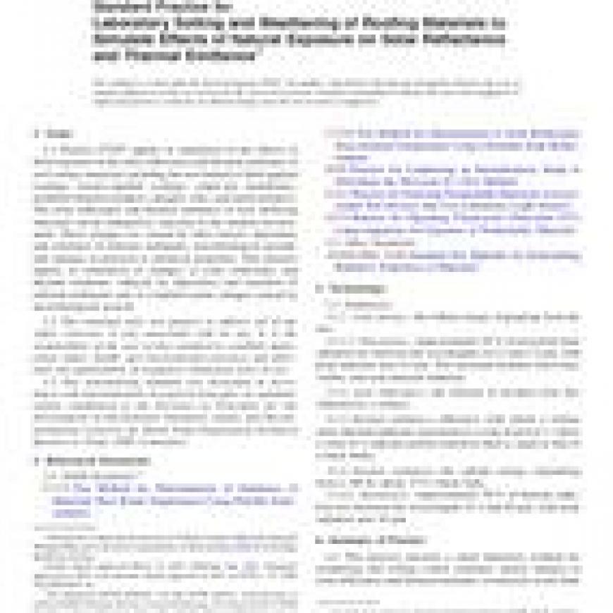1.1Practice D7897 applies to simulation of the effects of field exposure on the solar reflectance and thermal emittance of roof surface materials including but not limited to field-applied coatings, factory-applied coatings, single-ply membranes, modified bitumen products, shingles, tiles, and metal products. The solar reflectance and thermal emittance of roof surfacing materials can be changed by exposure to the outdoor environment. These changes are caused by three factors: deposition and retention of airborne pollutants; microbiological growth; and changes in physical or chemical properties. This practice applies to simulation of changes in solar reflectance and thermal emittance induced by deposition and retention of airborne pollutants and, to a limited extent, changes caused by microbiological growth.