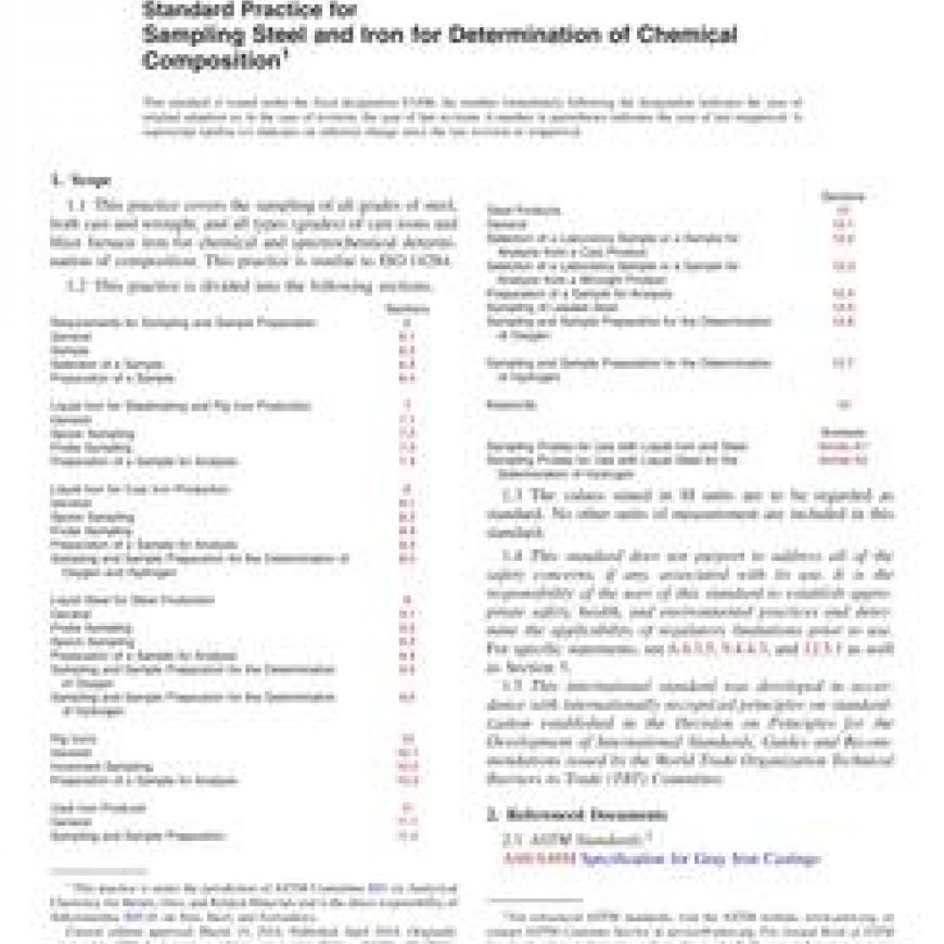 1.1This practice covers the sampling of all grades of steel, both cast and wrought, and all types (grades) of cast irons and blast furnace iron for chemical and spectrochemical determination of composition. This practice is similar to ISO14284.