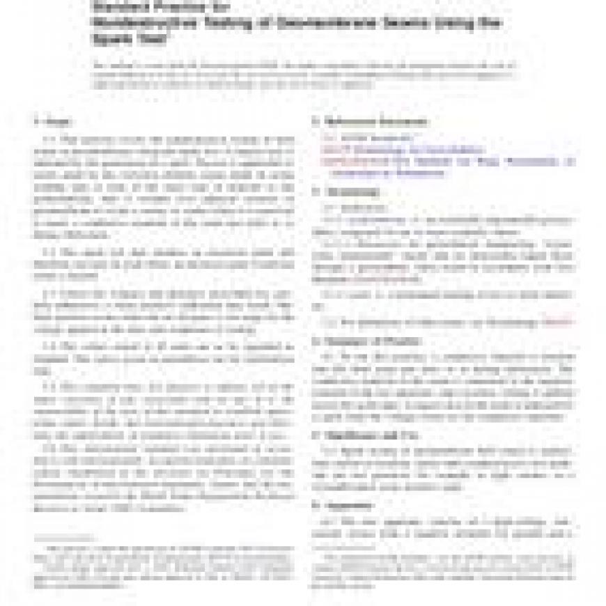1.1This practice covers the nondestructive testing of field seams in geomembranes using the spark test. A suspect area is indicated by the generation of a spark. The test is applicable to seams made by the extrusion method, seams made by using welding tape (a strip of the same type of material as the geomembrane, that is welded over adjacent sections of geomembrane to create a seam), or seams where it is practical to insert a conductive material in the seam just prior to or during fabrication.