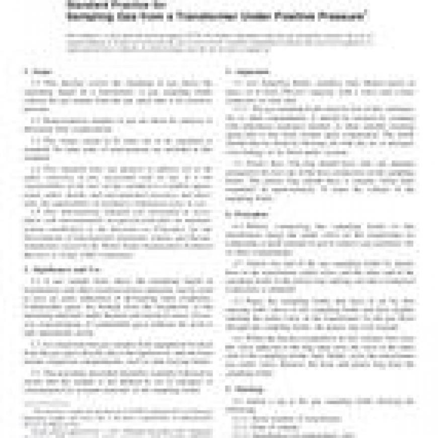 1.1This practice covers the sampling of gas above the insulating liquid of a transformer. A gas sampling bottle collects the gas sample from the gas space that is at a positive pressure.