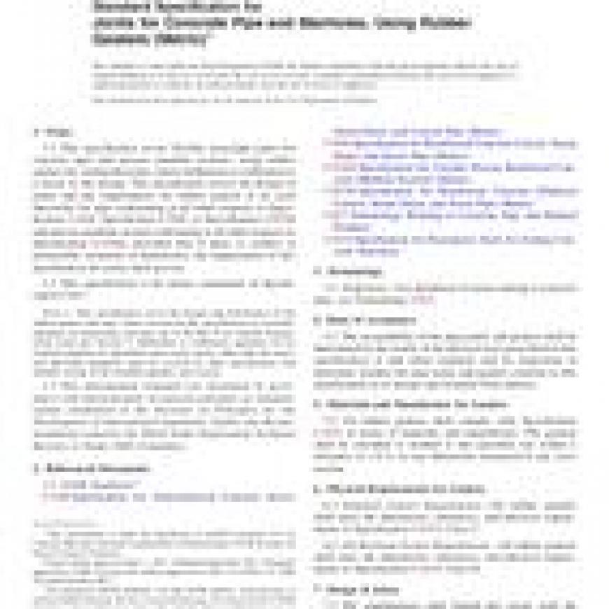 1.1This specification covers flexible watertight joints for concrete pipe and precast manhole sections, using rubber gaskets for sealing the joints, where infiltration or exfiltration is a factor in the design. The specification covers the design of joints and the requirements for rubber gaskets to be used therewith, for pipe conforming in all other respects to Specification C14M, Specification C76M, or Specification C507M and precast manhole section conforming in all other respects to Specification C478M, provided that if there is conflict in permissible variations in dimensions, the requirements of this specification for joints shall govern.