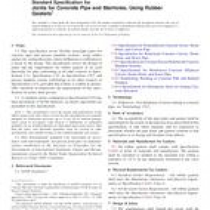 1.1This specification covers flexible watertight joints for concrete pipe and precast manhole sections, using rubber gaskets for sealing the joints, where infiltration or exfiltration is a factor in the design. The specification covers the design of joints and the requirements for rubber gaskets to be used therewith, for pipe conforming in all other respects to Specification C14, Specification C76, or Specification C507 and precast manhole section conforming in all other respects to Specification C478, provided that if there is conflict in permissible variations in dimensions the requirements of this specification for joints shall govern.