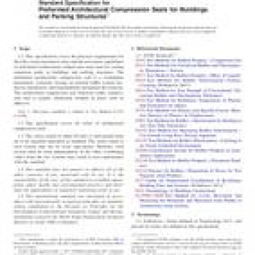 1.1This specification covers the physical requirements for the fully cured elastomeric alloy and the movement capabilities of preformed architectural compression seals used for sealing expansion joints in buildings and parking structures. The preformed architectural compression seal is a rectangular elastomeric extrusion, having an internal baffle system produced continuously and longitudinally throughout the material. The architectural compression seal functions under compression and is usually chemically bonded in place with an adhesive.