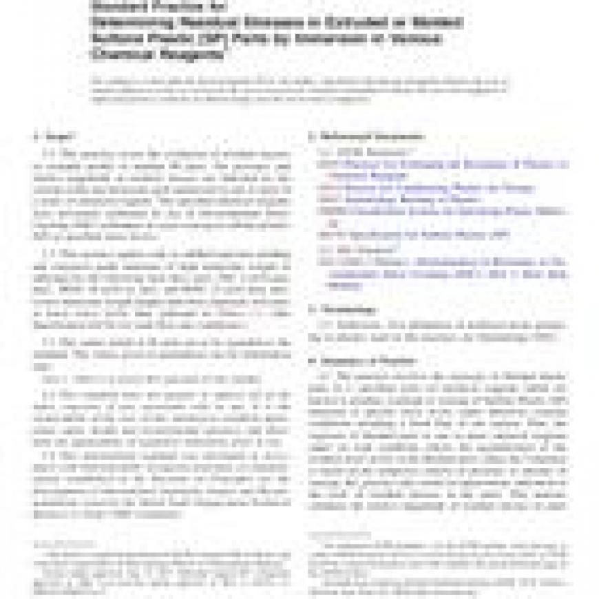 1.1This practice covers the evaluation of residual stresses in extruded profile or molded SP parts. The presence and relative magnitude of residual stresses are indicated by the crazing of the specimen part upon immersion in one or more of a series of chemical reagents. The specified chemical reagents were previously calibrated by use of Environmental Stress Cracking (ESC) techniques to cause crazing in sulfone plastics (SP) at specified stress levels.
