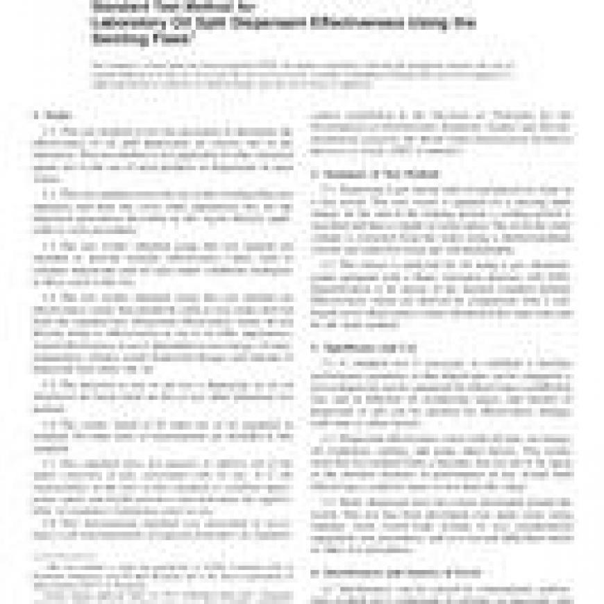 1.1This test method covers the procedure to determine the effectiveness of oil spill dispersants on various oils in the laboratory. This test method is not applicable to other chemical agents nor to the use of such products or dispersants in open waters.