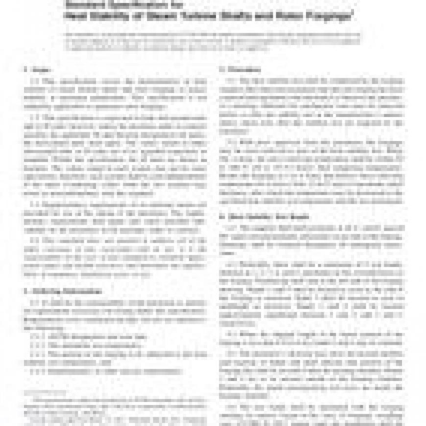 1.1This specification covers the determination of heat stability of steam turbine shafts and rotor forgings to ensure stability at operating temperature. This specification is not ordinarily applicable to generator rotor forgings.