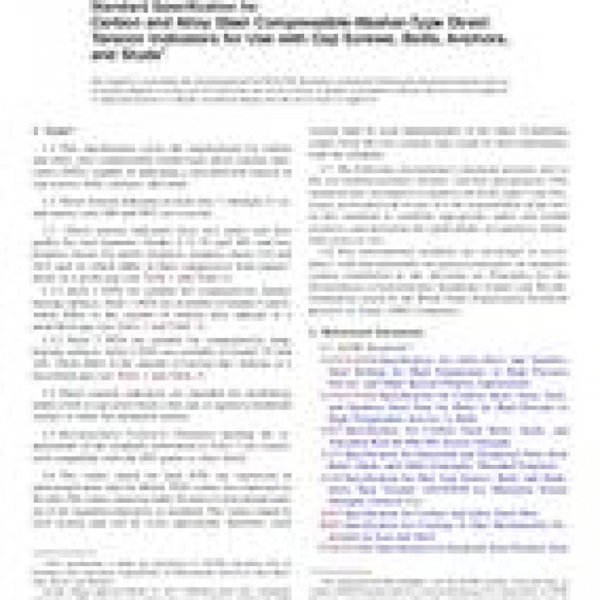 1.1This specification covers the requirements for carbon and alloy steel compressible-washer-type direct tension indicators (DTIs) capable of indicating a specified bolt tension in cap screws, bolts, anchors, and studs.