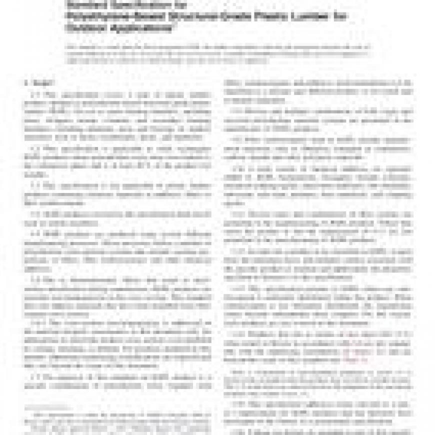 1.1This specification covers a type of plastic lumber product, defined as polyethylene-based structural-grade plastic lumber (SGPL), for use as main framing members, including joists, stringers, beams, columns; and secondary framing members, including planking, posts and bracing; in outdoor structures such as decks, boardwalks, docks, and platforms.