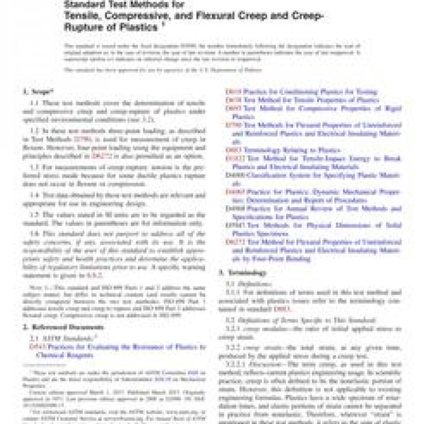 1.1These test methods cover the determination of tensile and compressive creep and creep-rupture of plastics under specified environmental conditions (see 3.2).