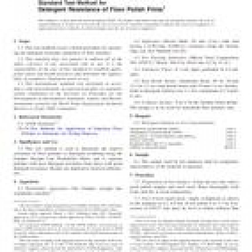 1.1This test method covers a bench procedure for measuring the detergent resistance properties of floor polishes.