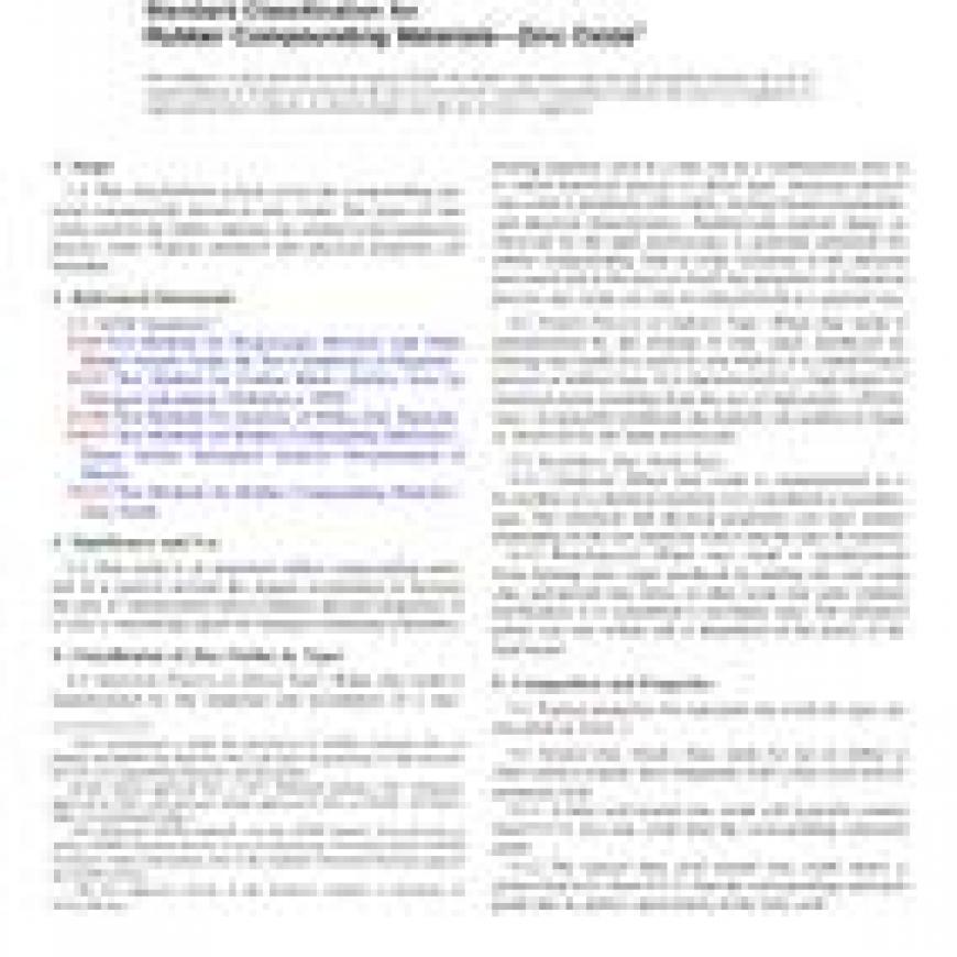 1.1This classification system covers the compounding material commercially known as zinc oxide. The types of zinc oxide used in the rubber industry are related to the production process used. Typical chemical and physical properties are included.