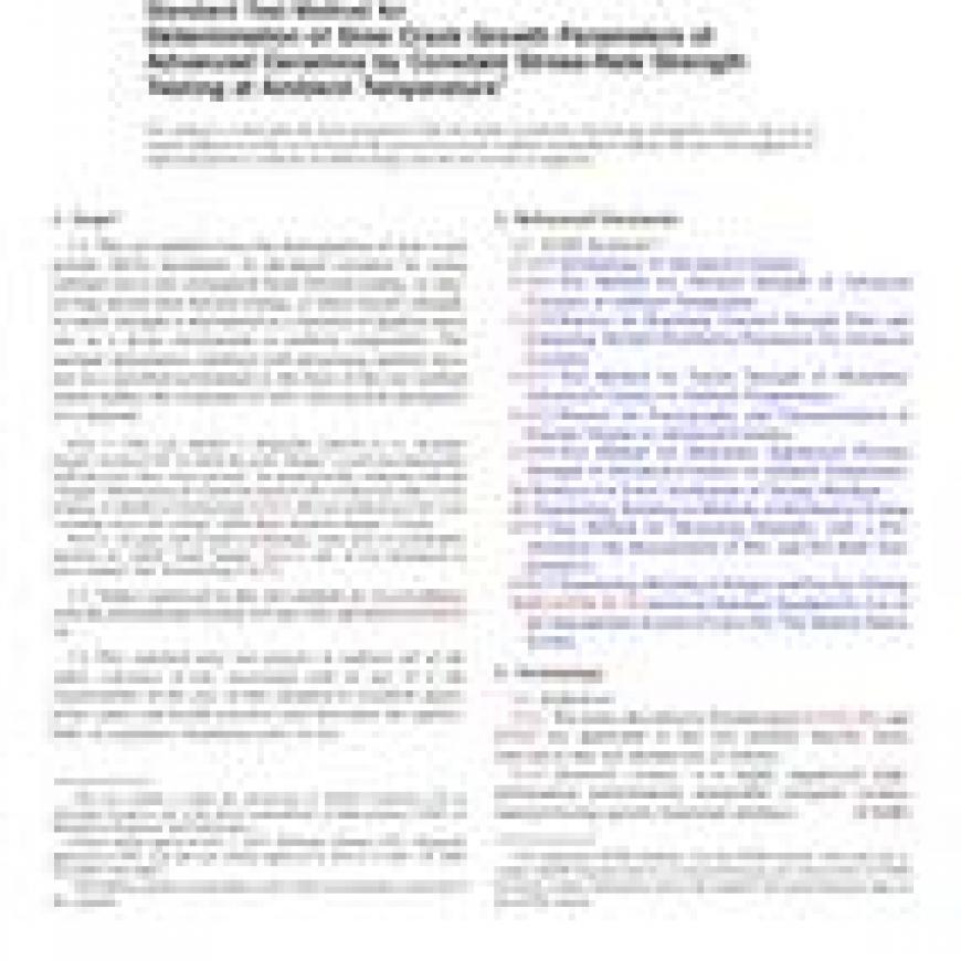 1.1This test method covers the determination of slow crack growth (SCG) parameters of advanced ceramics by using constant stress-rate rectangular beam flexural testing, or ring-on-ring biaxial disk flexural testing, or direct tensile strength, in which strength is determined as a function of applied stress rate in a given environment at ambient temperature. The strength degradation exhibited with decreasing applied stress rate in a specified environment is the basis of this test method which enables the evaluation of slow crack growth parameters of a material.
