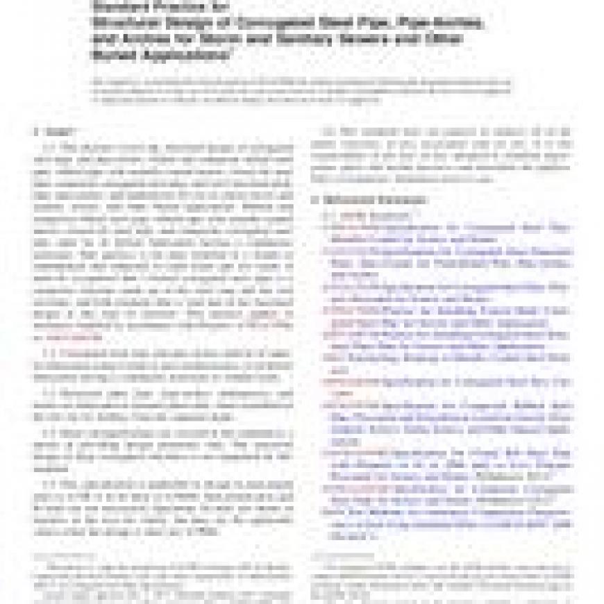 1.1This practice covers the structural design of corrugated steel pipe and pipe-arches, ribbed and composite ribbed steel pipe, ribbed pipe with metallic-coated inserts, closed rib steel pipe, composite corrugated steel pipe, and steel structural plate pipe, pipe-arches, and underpasses for use as storm sewers and sanitary sewers, and other buried applications. Ribbed and composite ribbed steel pipe, ribbed pipe with metallic-coated inserts, closed rib steel pipe, and composite corrugated steel pipe shall be of helical fabrication having a continuous lockseam. This practice is for pipe installed in a trench or embankment and subjected to earth loads and live loads. It must be recognized that a buried corrugated steel pipe is a composite structure made up of the steel ring and the soil envelope, and both elements play a vital part in the structural design of this type of structure. This practice applies to structures installed in accordance with Practice A798/A798M or A807/A807M.