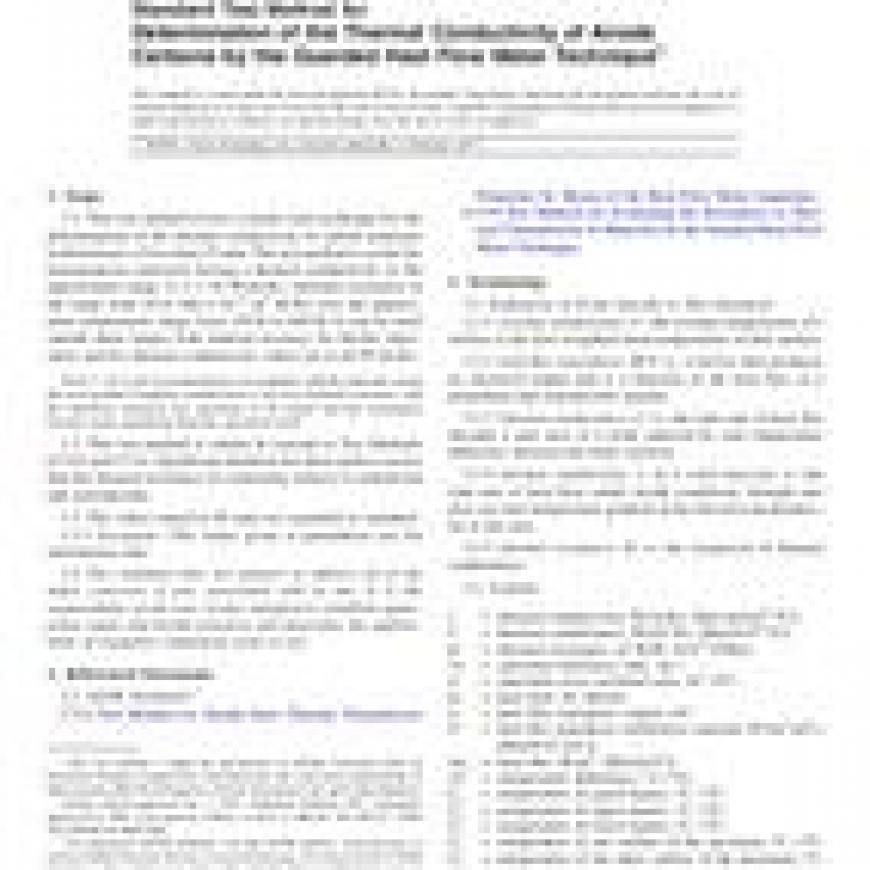 1.1This test method covers a steady-state technique for the determination of the thermal conductivity of carbon materials in thicknesses of less than 25mm. The test method is useful for homogeneous materials having a thermal conductivity in the approximate range 1 30 W/(mK), (thermal resistance in the range from 10 to 400 104 m2 K/W) over the approximate temperature range from 150K to 600K. It can be used outside these ranges with reduced accuracy for thicker specimens and for thermal conductivity values up to 60W/(mK).