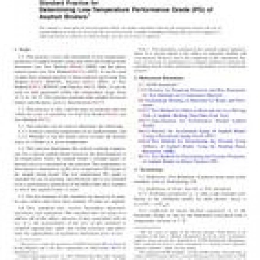 1.1This practice covers the calculation of low-temperature properties of asphalt binders using data from the bending beam rheometer (see Test Method D6648) (BBR) and the direct tension tester (see Test Method D6723) (DTT). It can be used on data from unaged material or from material aged using Test Method D2872 (RTFOT), Practice D6521 (PAV), or Test Method D2872 (RTFOT) and Practice D6521 (PAV). It can be used on data generated within the temperature range from +6C to -36C. This practice generates data suitable for use in binder specifications such as Specification D6373.