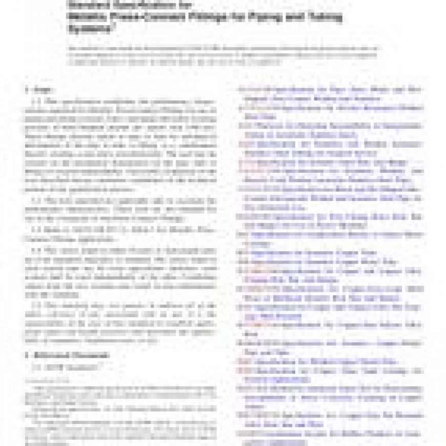 1.1This specification establishes the performance characteristics required for Metallic Press-Connect Fittings for use in piping and tubing systems with a maximum allowable working pressure of three-hundred pounds per square inch (300 psi). These fittings directly attach to pipe or tube by mechanical deformation of the pipe or tube or fitting, or a combination thereof, creating a seal and a restrained joint. The seal may be created via the mechanical deformation (of the pipe, tube or fitting) or created independently. Successful completion of the tests described herein constitutes completion of the technical portion of the qualification process.