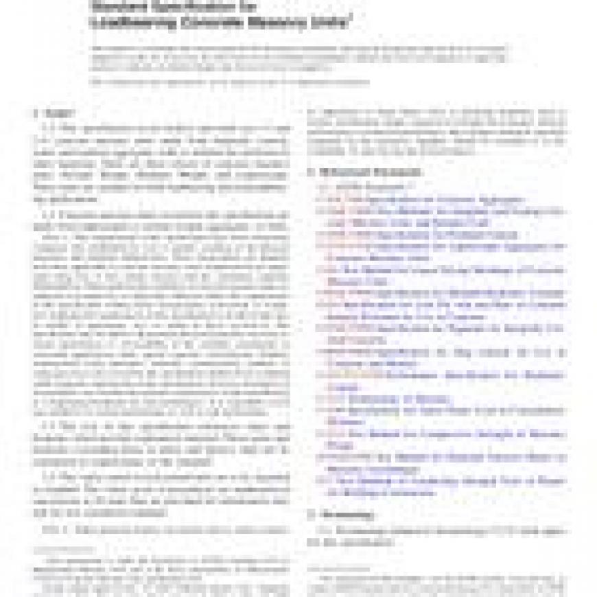 1.1This specification covers hollow and solid (see 5.3 and 5.4) concrete masonry units made from hydraulic cement, water, and mineral aggregates with or without the inclusion of other materials. There are three classes of concrete masonry units: Normal Weight, Medium Weight, and Lightweight. These units are suitable for both loadbearing and nonloadbearing applications.