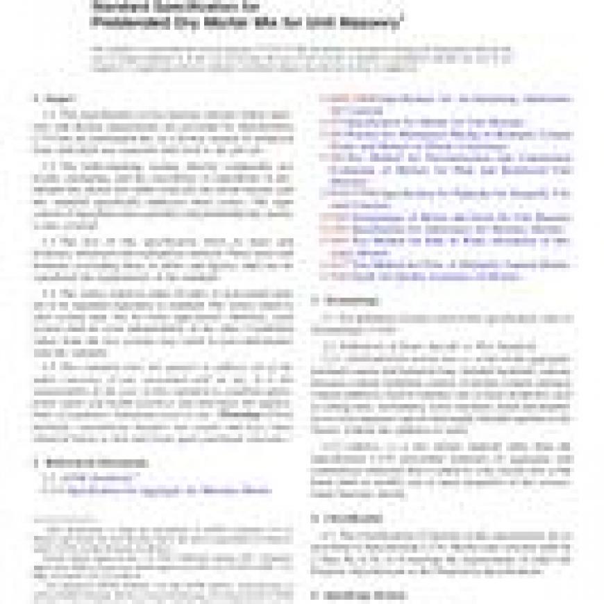 1.1This specification covers masonry mortars whose materials and design requirements are governed by Specification C270 but are preblended dry in a factory instead of produced from individual raw materials delivered to the job-site.
