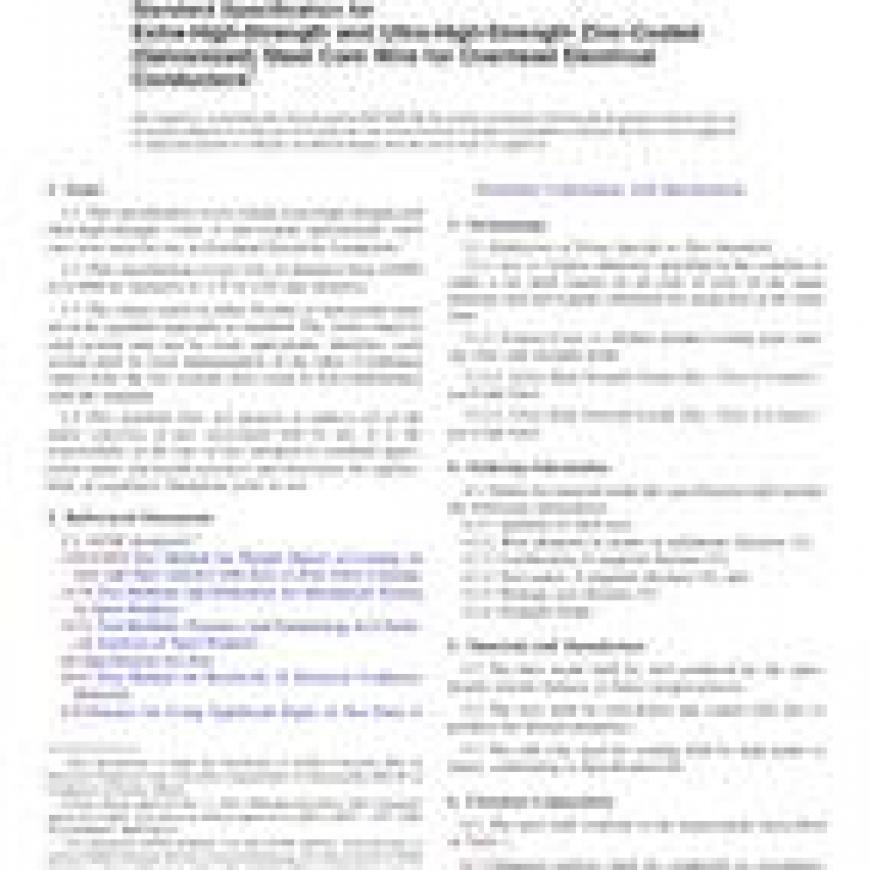 1.1This specification covers round, extra-high-strength and ultra-high-strength, Class A zinc-coated (galvanized), steel core wire used for use in Overhead Electrical Conductors.