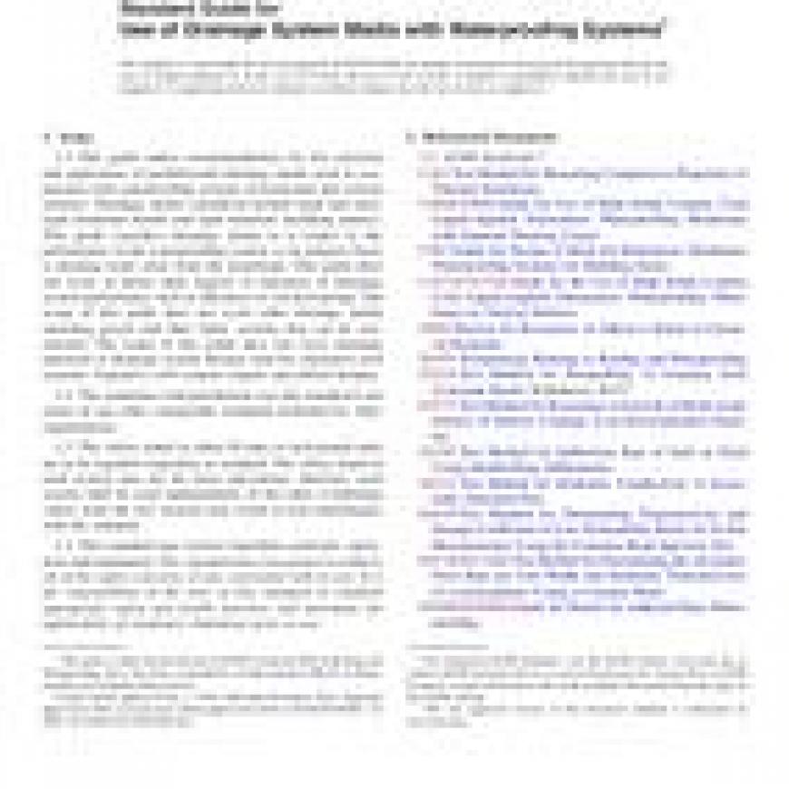 1.1This guide makes recommendations for the selection and application of prefabricated drainage media used in conjunction with waterproofing systems on horizontal and vertical surfaces. Drainage media considered include rigid and semi-rigid insulation boards and rigid materials including plastics. This guide considers drainage media as it relates to the performance of the waterproofing system, so its primary focus is draining water away from the membrane. This guide does not cover in detail other aspects or functions of drainage system performance such as efficiency of soil dewatering. The scope of this guide does not cover other drainage media including gravel and filter fabric systems that can be constructed. The scope of this guide does not cover drainage materials or drainage system designs used for vegetative roof systems. Vegetative roof systems require specialized designs.