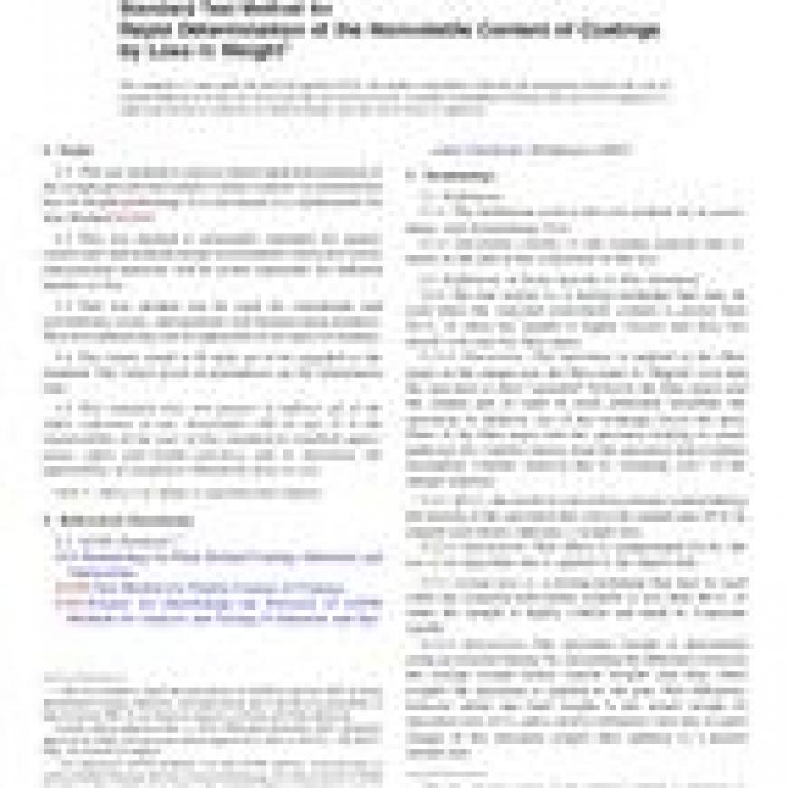 1.1This test method is used to obtain rapid determination of the weight percent nonvolatile (solids) content via instrumental loss in weight technology. It is not meant as a replacement for Test Method D2369.