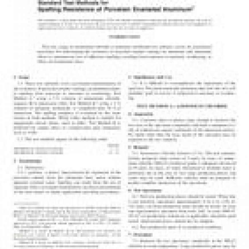 1.1These test methods cover accelerated determination of the resistance of porcelain enamel coatings on aluminum alloys to spalling from exposure to moisture or weathering. Test Method A,2 using a 5% solution of ammonium chloride, requires 96-h immersion while Test Method B,3 using a 1% solution of antimony trichloride, is completed after 20 h of immersion. The spalling tendency is evaluated by the same criteria in both methods. While either method is suitable for magnesium silicon alloys, such as 6061, Test Method B is preferred for simple alloys or commercially pure aluminum, such as 1100.