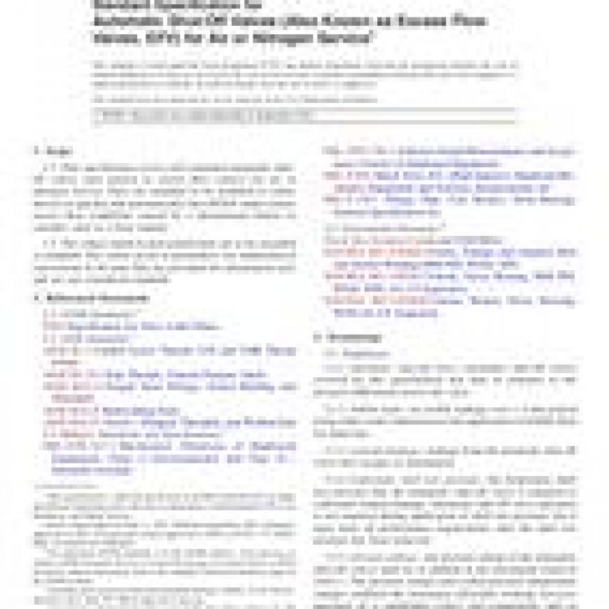 1.1This specification covers self-contained automatic shut-off valves (also known as excess flow valves) for air or nitrogen service. They are intended to be installed as safety devices to quickly and automatically shut off flow under certain excess flow conditions caused by a downstream failure or casualty, such as a hose rupture.