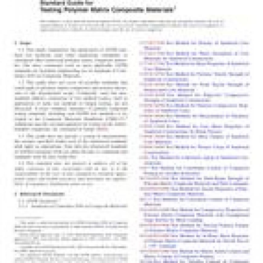 1.2This guide does not cover all possible standards that could apply to polymer matrix composites and restricts discussion to the documented scope. Commonly used but non-standard industry extensions of test method scopes, such as application of static test methods to fatigue testing, are not discussed. A more complete summary of general composite testing standards, including non-ASTM test methods, is included in the Composite Materials Handbook (CMH-17).2 Additional specific recommendations for testing textile (fabric, braided) composites are contained in Guide D6856.