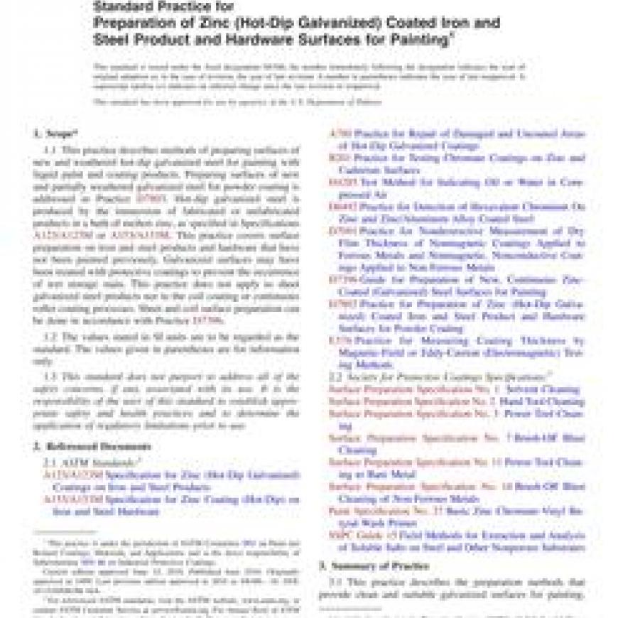 1.1This practice describes methods of preparing surfaces of new and weathered hot-dip galvanized steel for painting with liquid paint and coating products. Preparing surfaces of new and partially weathered galvanized steel for powder coating is addressed in Practice D7803. Hot-dip galvanized steel is produced by the immersion of fabricated or unfabricated products in a bath of molten zinc, as specified in Specifications A123/A123M or A153/A153M. This practice covers surface preparation on iron and steel products and hardware that have not been painted previously. Galvanized surfaces may have been treated with protective coatings to prevent the occurrence of wet storage stain. This practice does not apply to sheet galvanized steel products nor to the coil coating or continuous roller coating processes. Sheet and coil surface preparation can be done in accordance with Practice D7396.