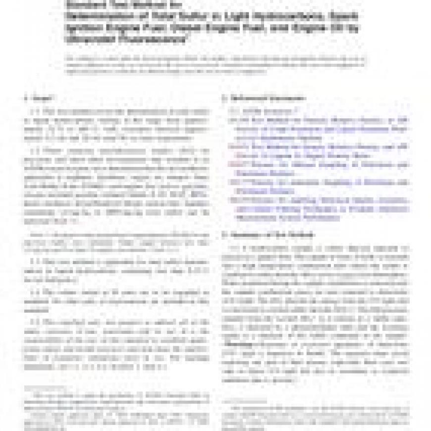 ASTM D5453-16 Standard Test Method for Determination of Total Sulfur in Light Hydrocarbons, Spark Ignition Engine Fuel, Diesel Engine Fuel, and Engine Oil by Ultraviolet Fluorescence