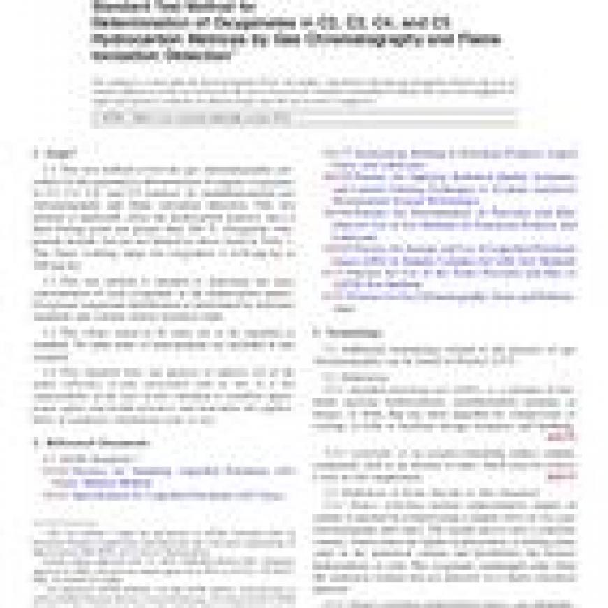 ASTM D7423-16e1 Standard Test Method for Determination of Oxygenates in C2, C3, C4, and C5 Hydrocarbon Matrices by Gas Chromatography and Flame Ionization Detection