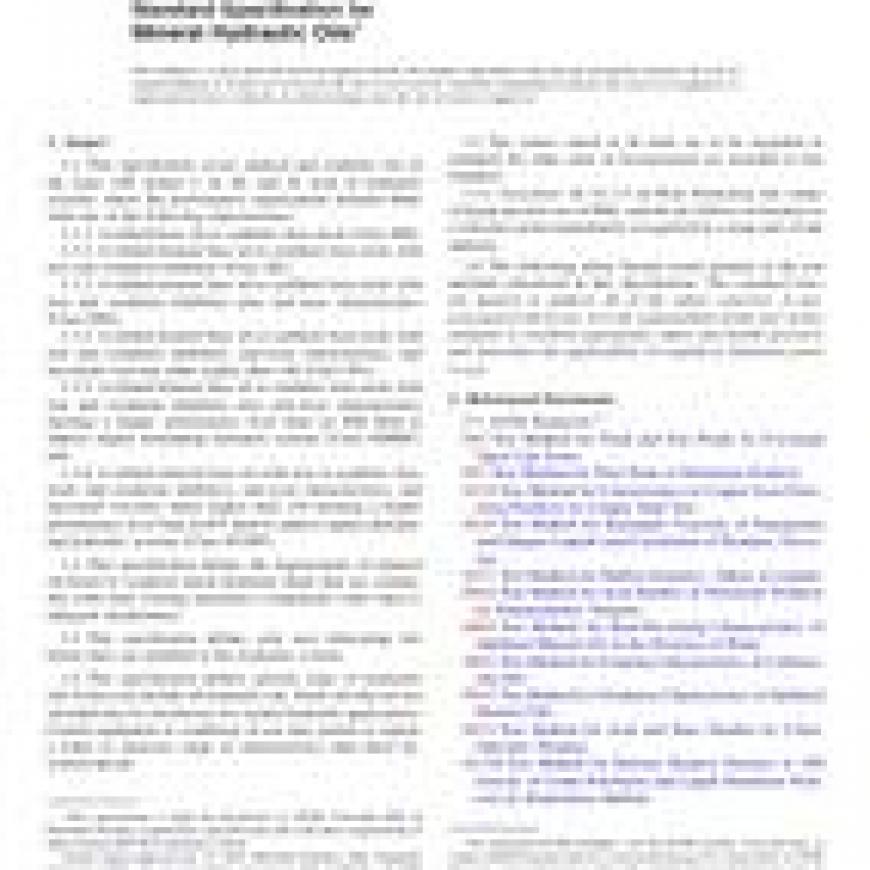 1.2This specification defines the requirements of mineral oil-based or synthetic-based hydraulic fluids that are compatible with most existing machinery components when there is adequate maintenance.