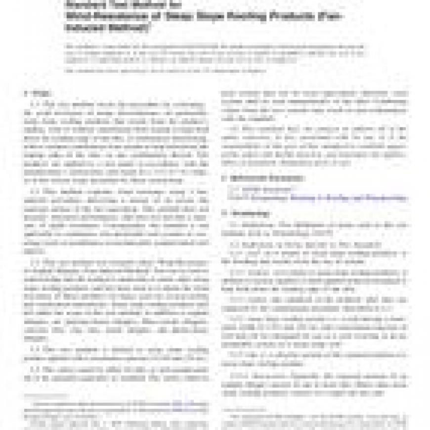 1.1This test method covers the procedure for evaluating the wind resistance of many discontinuous, air permeable, steep slope roofing products that results from the product's rigidity, with or without contribution from sealant to help hold down the leading edge of the tabs, or mechanical interlocking, with or without contribution from sealant to help hold down the leading edge of the tabs, or any combination thereof. The products are applied to a test panel in accordance with the manufacturers instructions and tested at a 2:12 (17%) slope, or at the lowest slope permitted by those instructions.