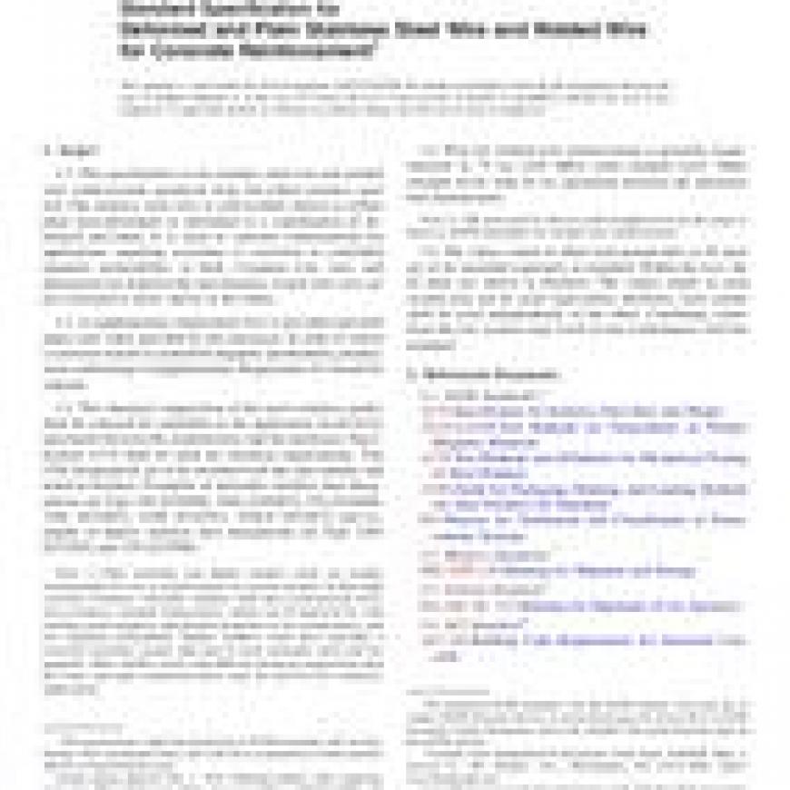 1.1This specification covers stainless steel wire and welded wire reinforcement produced from hot-rolled stainless steel rod. The stainless steel wire is cold-worked, drawn or rolled, plain (non-deformed) or deformed or a combination of deformed and plain. It is used as concrete reinforcement for applications requiring resistance to corrosion or controlled magnetic permeability, or both. Common wire sizes and dimensions are found in this specification. Actual wire sizes are not restricted to those shown in the tables.