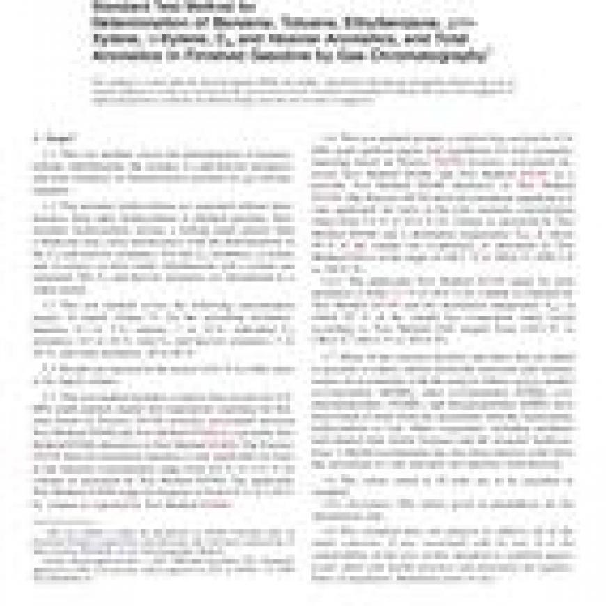 ASTM D5580-15 Standard Test Method for Determination of Benzene, Toluene, Ethylbenzene, <emph type="ital"> p/m</emph>-Xylene, <emph type="ital">o</emph>-Xylene, C9 and Heavier Aromatics, and Total Aromatics in Finished Gasoline by Gas Chromatography