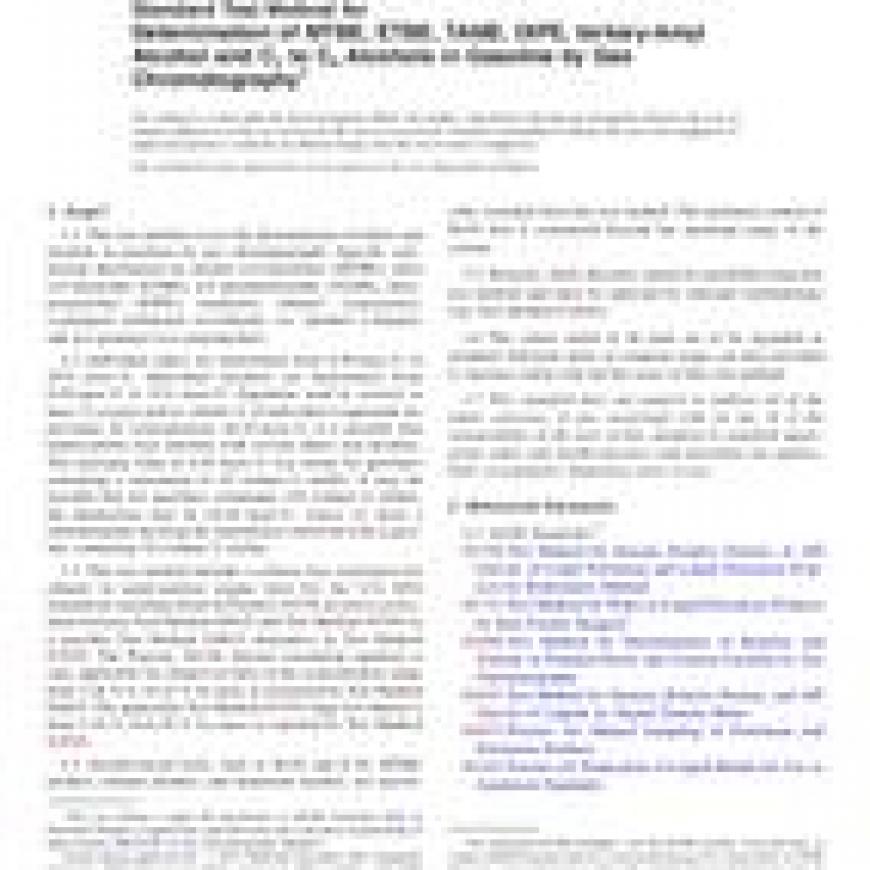 ASTM D4815-15b Standard Test Method for Determination of MTBE, ETBE, TAME, DIPE, tertiary-Amyl Alcohol and C1 to C4 Alcohols in Gasoline by Gas Chromatography