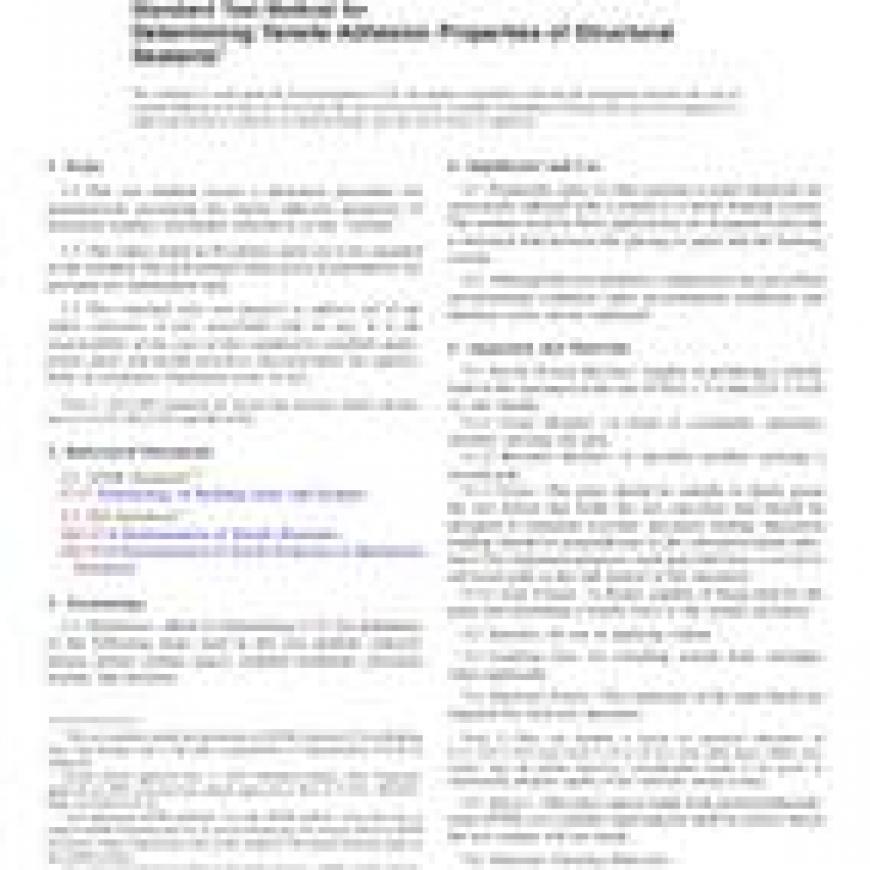 1.1This test method covers a laboratory procedure for quantitatively measuring the tensile adhesion properties of structural sealants, hereinafter referred to as the sealant.