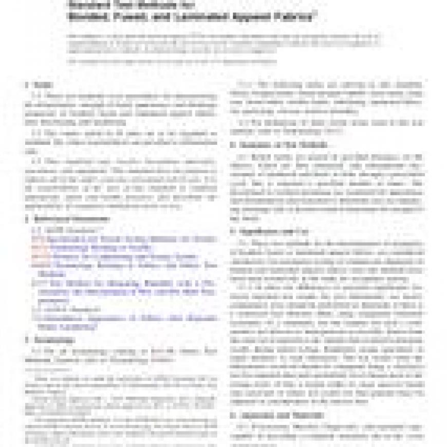 1.1These test methods cover procedures for characterizing the delamination, strength of bond, appearance, and shrinkage propensity of bonded, fused, and laminated apparel fabrics after drycleaning and laundering.