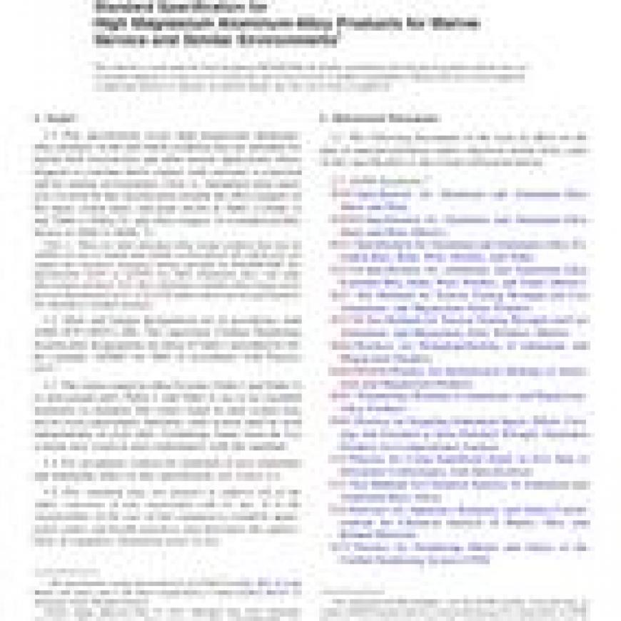 1.1This specification covers high magnesium aluminum-alloy products in the mill finish condition that are intended for marine hull construction and other marine applications where frequent or constant direct contact with seawater is expected and for similar environments (Note 1). Aluminum alloy products covered by this specification include the alloy-tempers of flat sheet, coiled sheet, and plate shown in Table 2 [Table 3] and Table 4 [Table 5], and alloy-tempers of extruded profiles shown in Table 6 [Table 7].